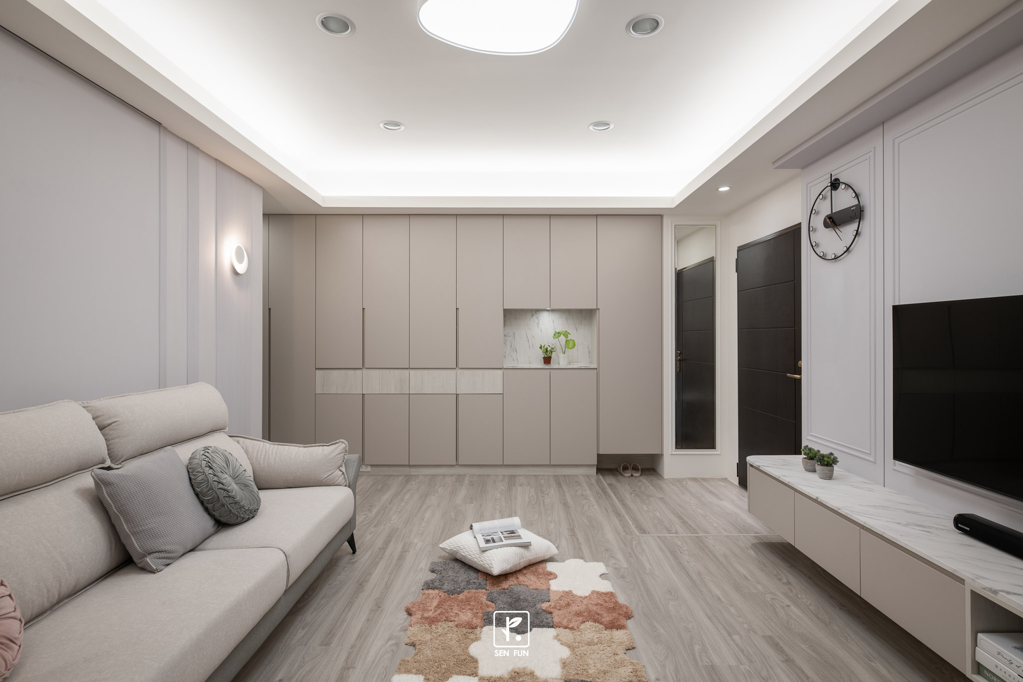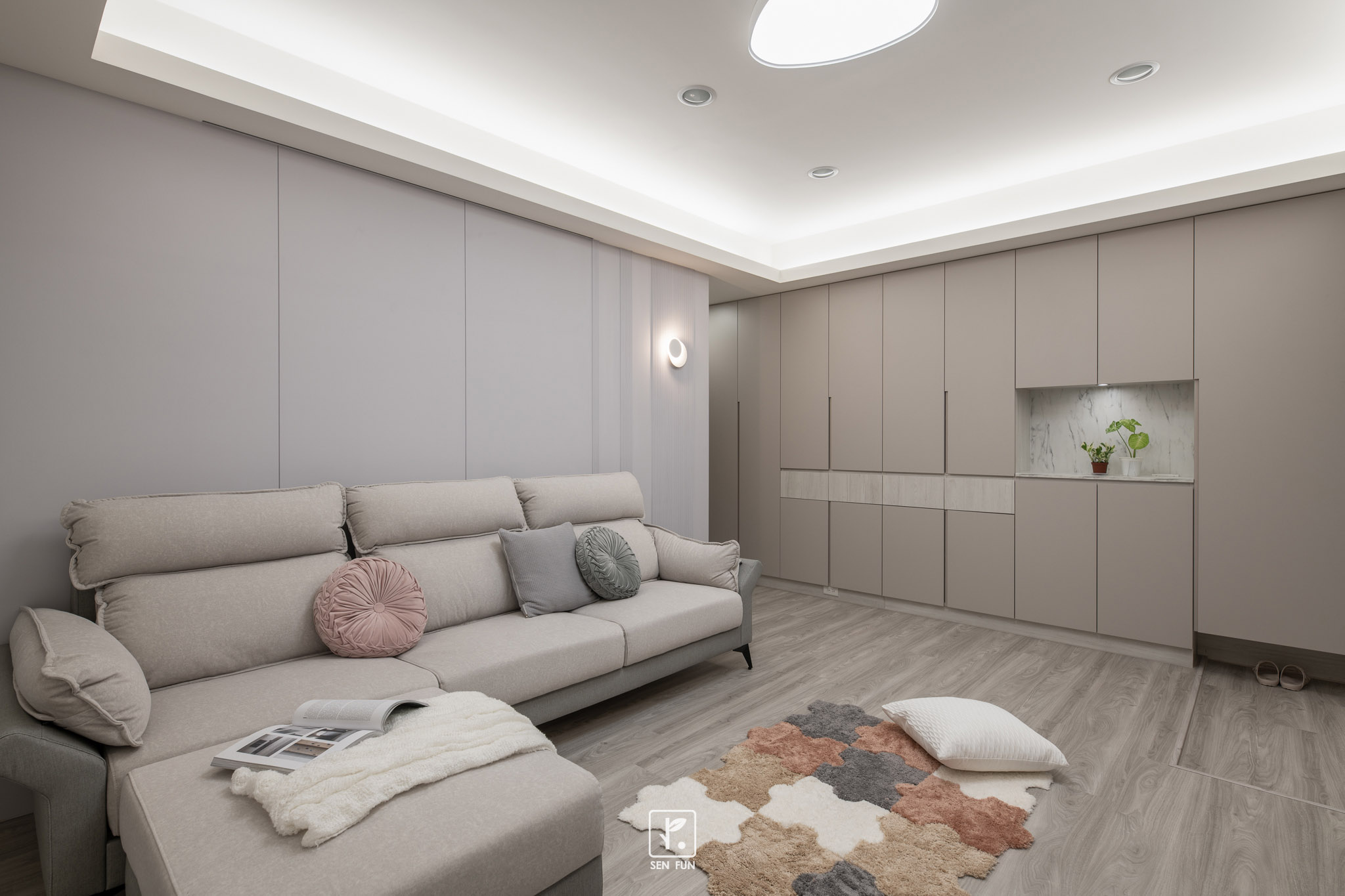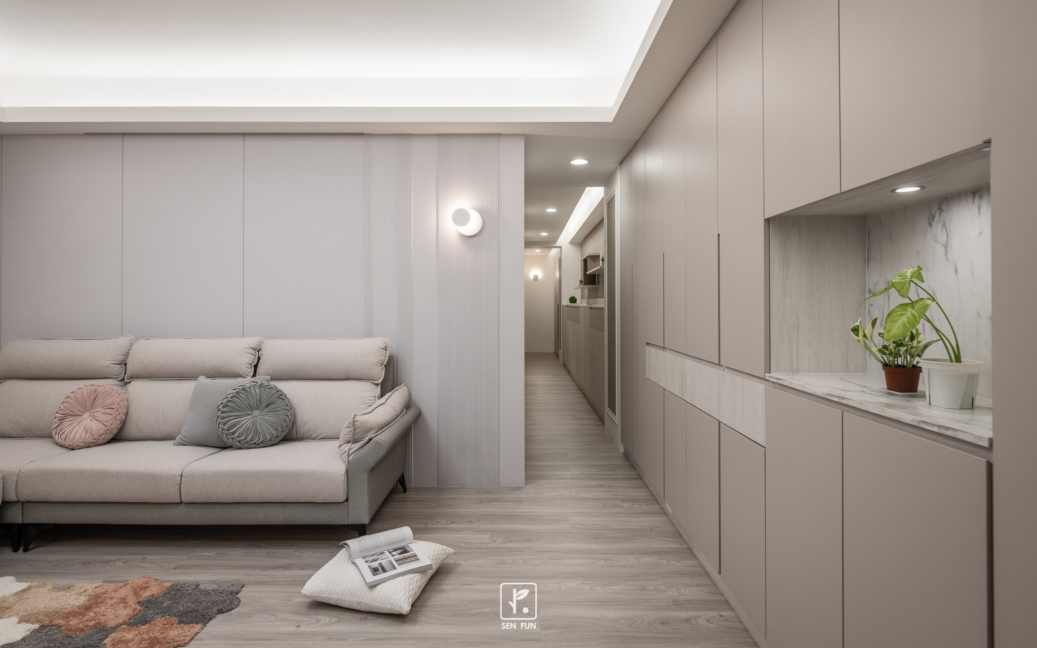經過設計規劃,在空間中巧妙地的安排收納位置並以淺木色+奶茶色作為主色基調讓整個空間視覺放大,營造空間的舒適性