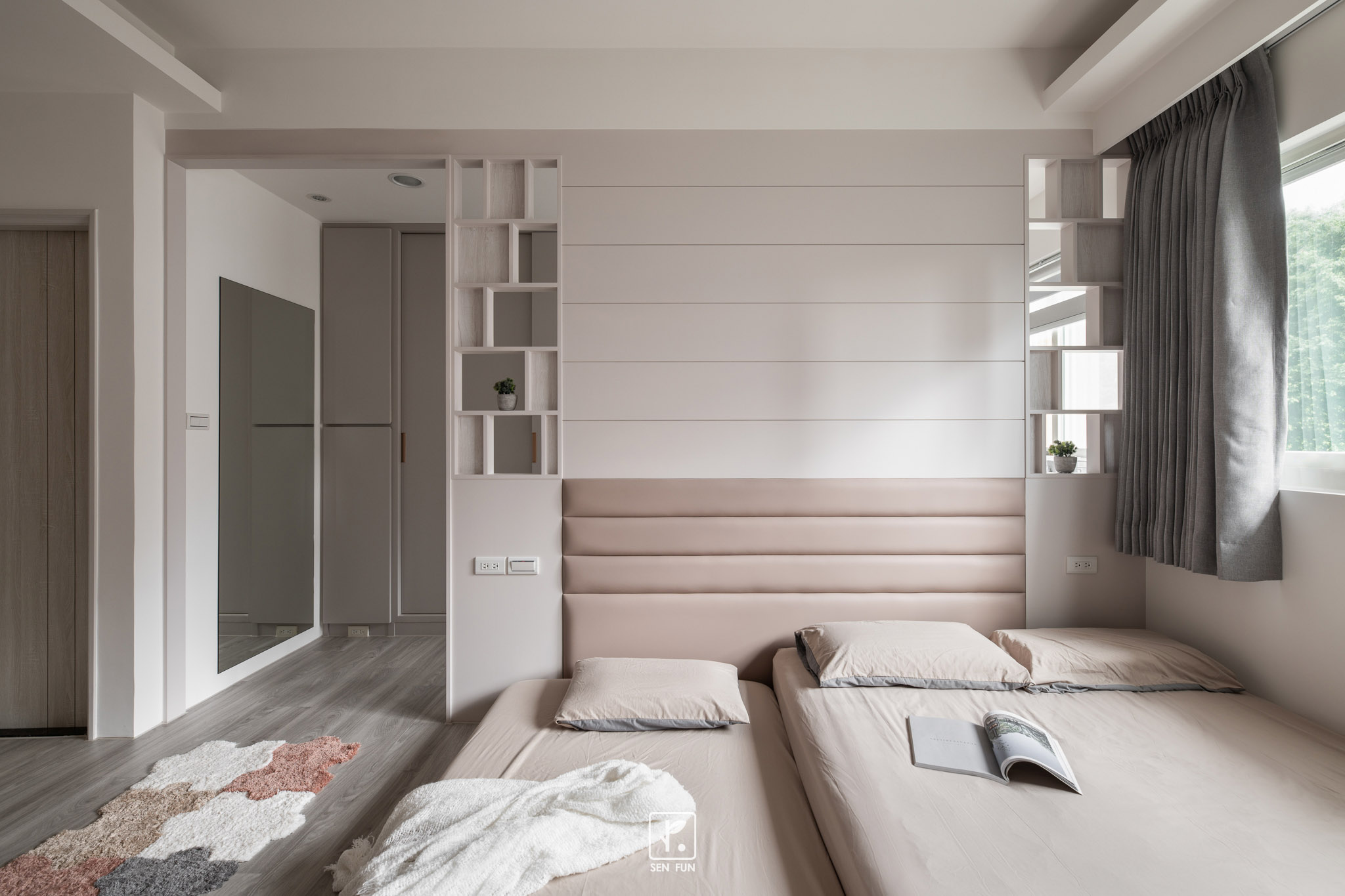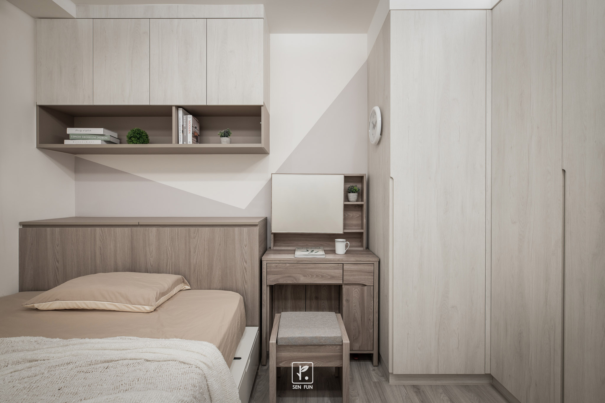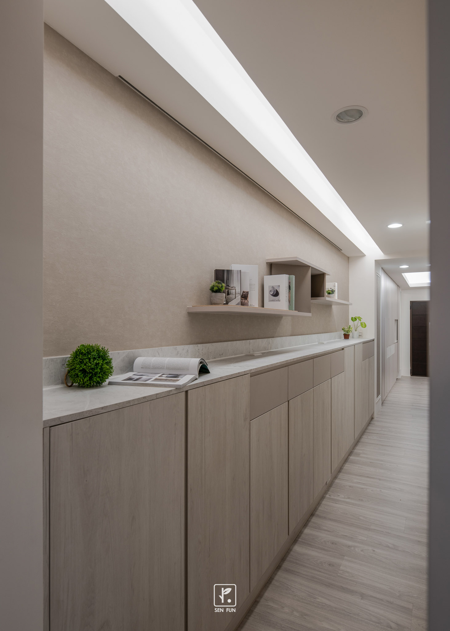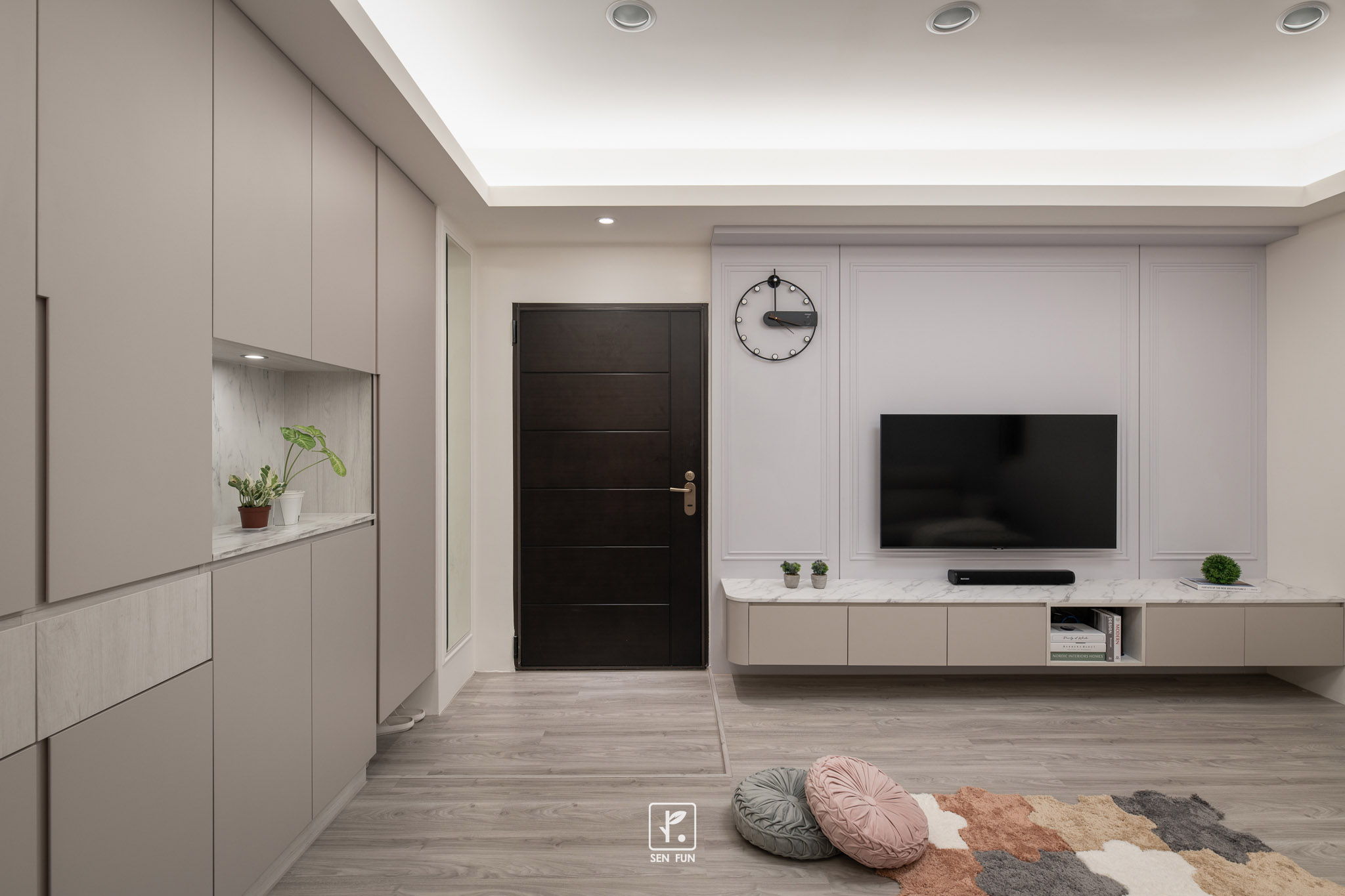 經過設計規劃,在空間中巧妙地的安排收納位置並以淺木色+奶茶色作為主色基調讓整個空間視覺放大,營造空間的舒適性