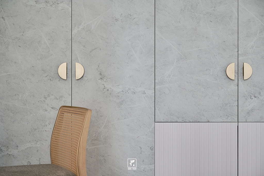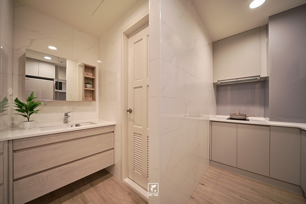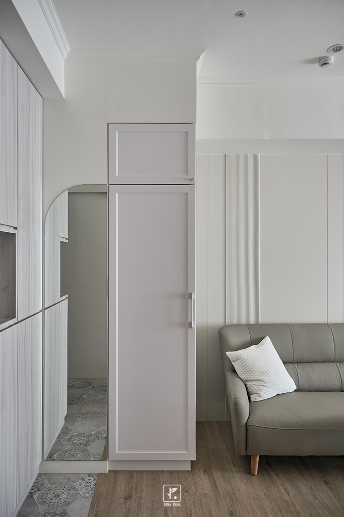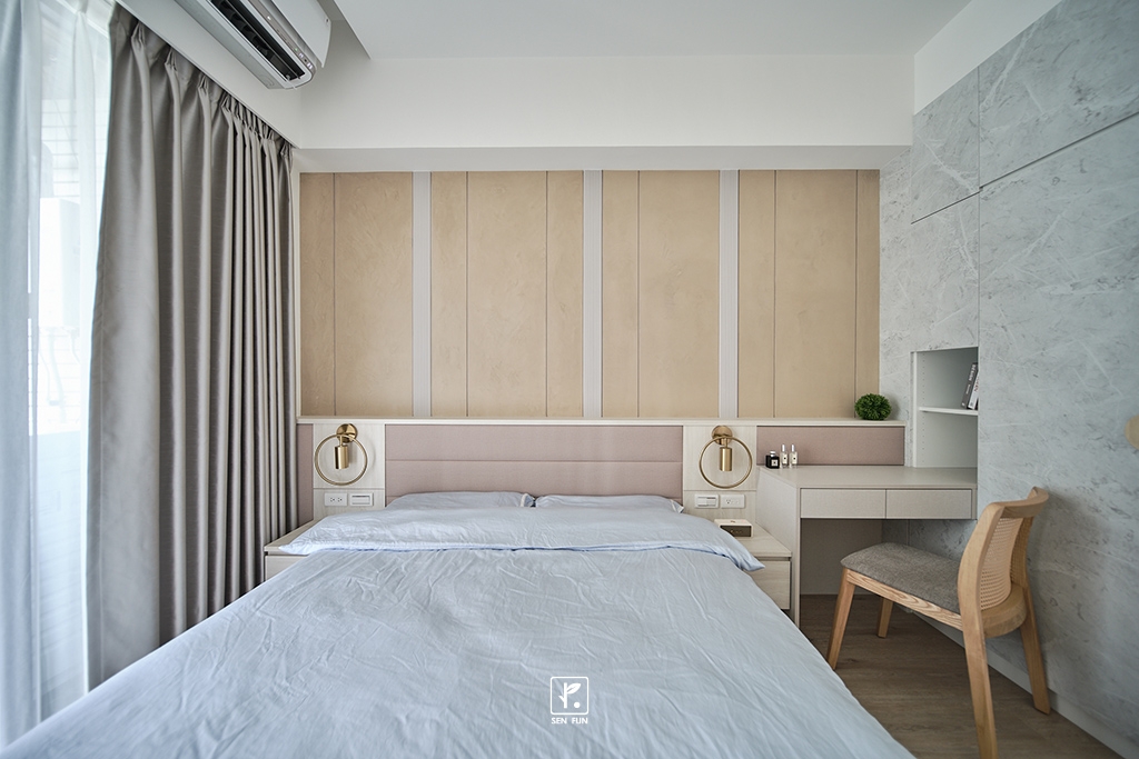 配合牆面線條的延伸,奶茶色及大地色調交互運用搭配著,