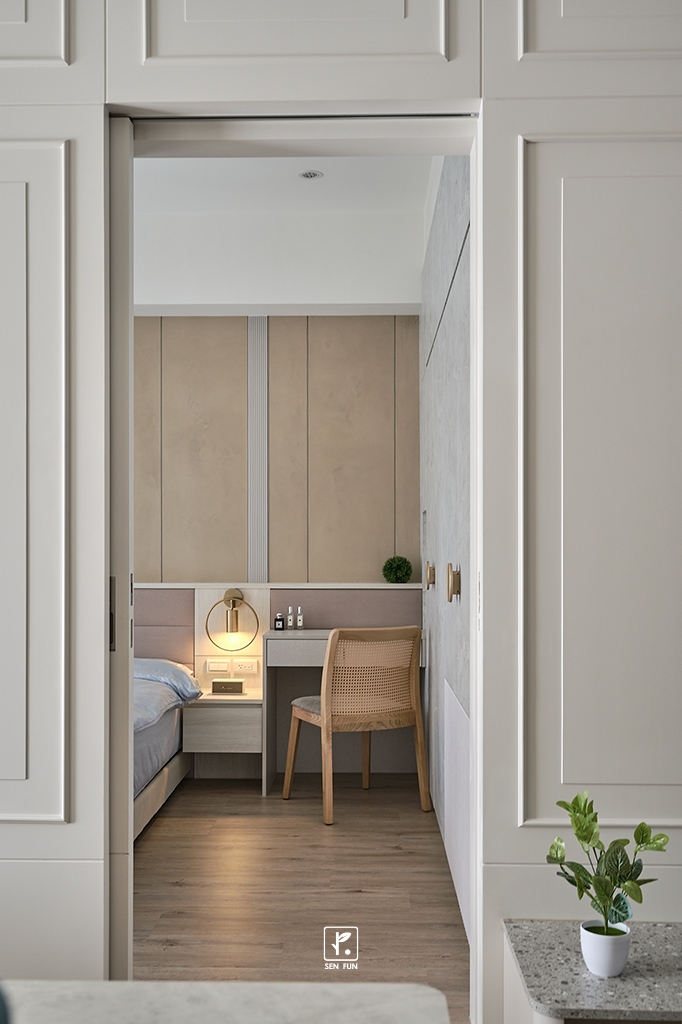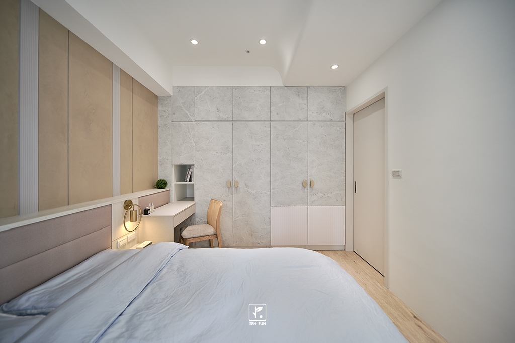 - 主臥的橫拉門與電視牆做一整體的造型變化,偷偷將門隱藏其中