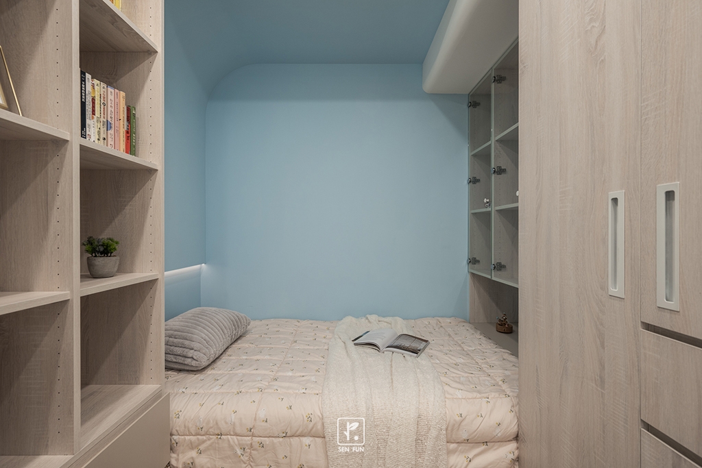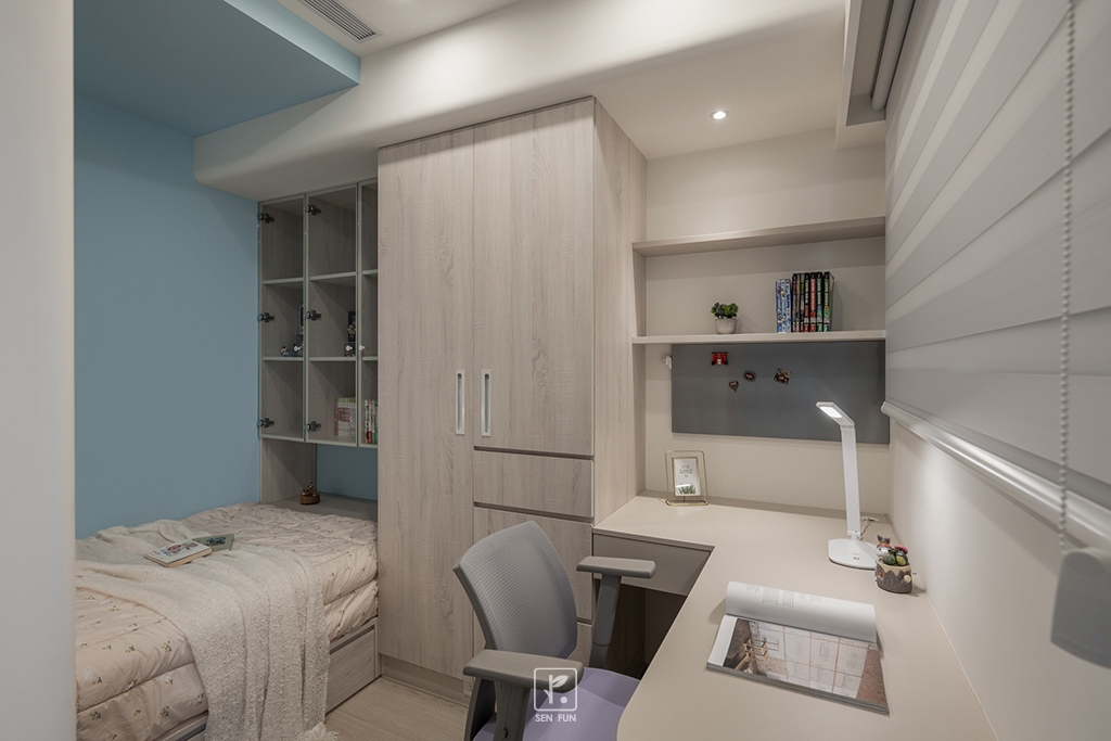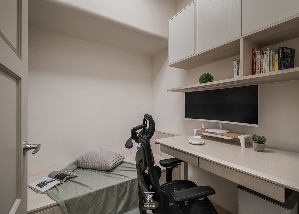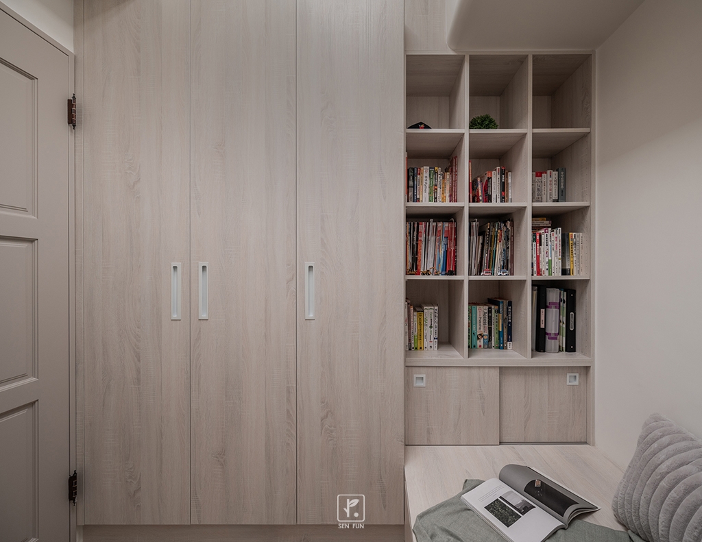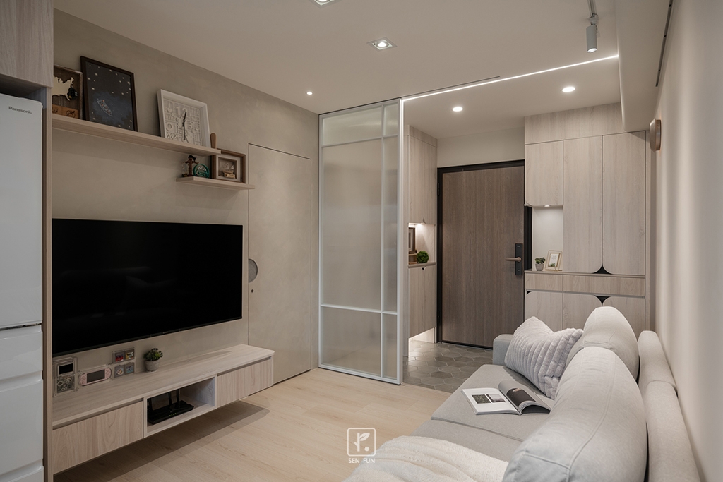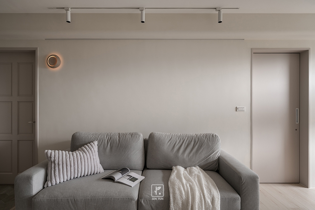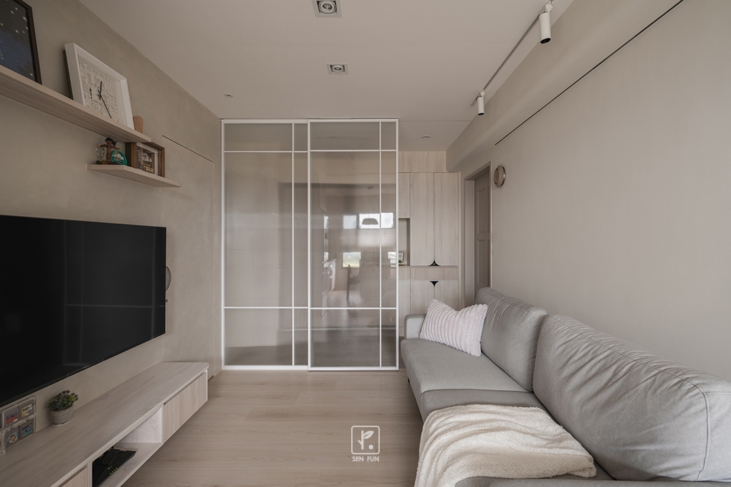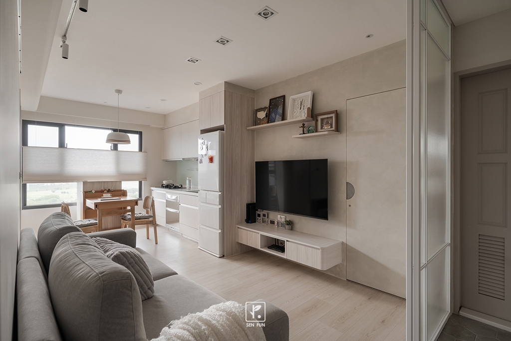 以日式侘寂為設計主軸,在有限尺度中拿捏留白與機能開放式廚房串聯餐廳與客廳,使動線流暢、視覺延伸主臥、小孩房與書房依生活需求配置收納尺度,兼顧實用與空間純淨感玄關以拉門式屏風界定內外,保留彈性與儀式感;牆面施作斯曼特塗料,呈現低調肌理,讓不完美成為日常中最耐看的風景