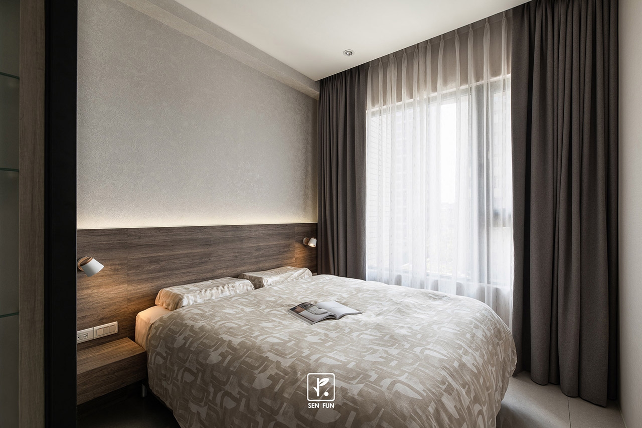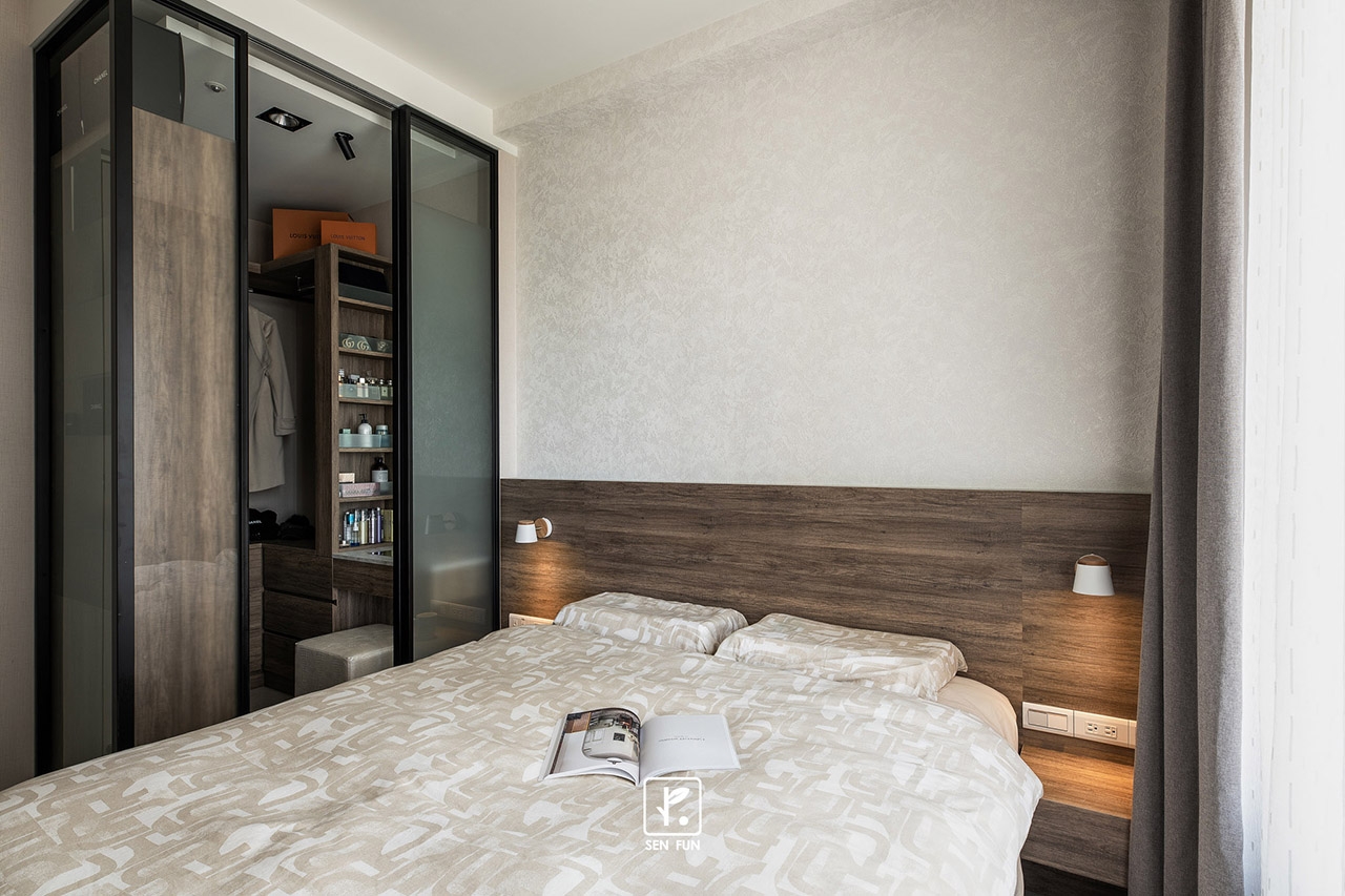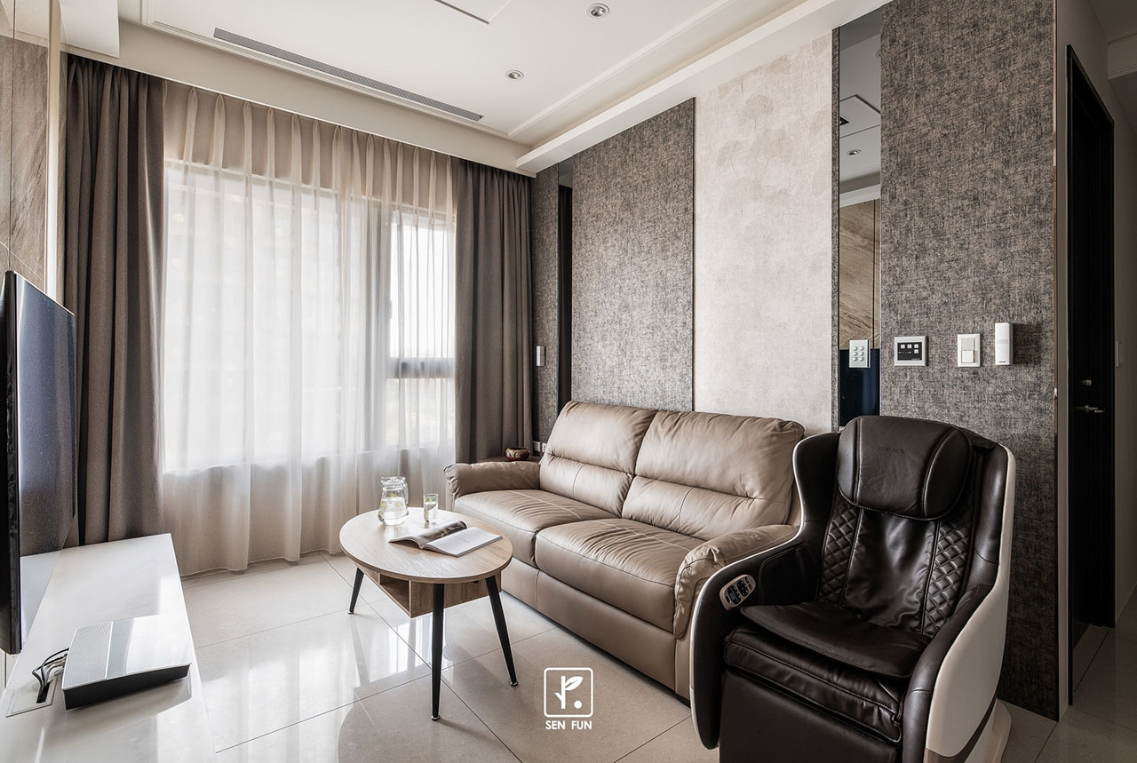 沙發牆使用進口壁布搭配些許明鏡做線條分割